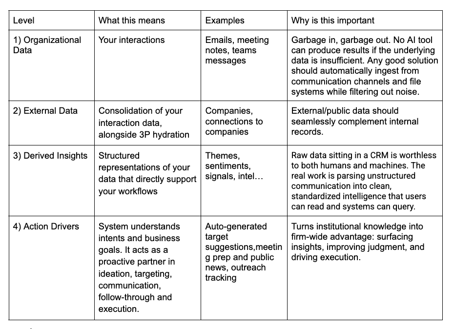 We’ve spoken to dozens of advisory firms; they’ve told us that their setup for levels 1 and 2 is fragmented, incomplete, and cumbersome, resulting in low-adoption. For levels 3 and 4 (insights and action drivers), tech hasn’t provided any systematic approaches to origination at all! Most are focused on junior efficiency or generic chatbots (more to come on this point in a separate article).